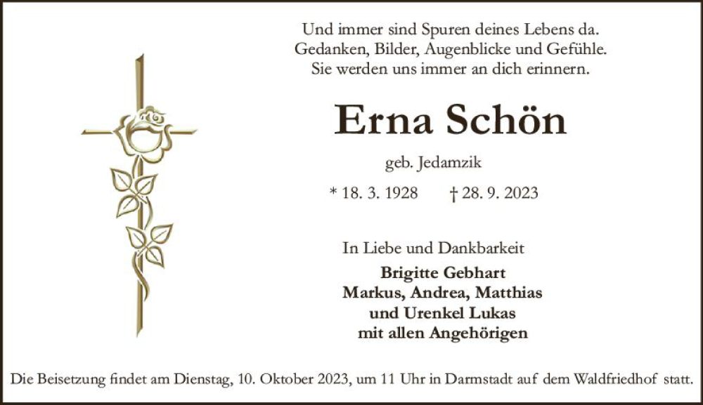 Hier finden Sie alle Traueranzeigen aus der Zeitung, die bisher für Erna Schön erschienen sind. Weitere Traueranzeigen, die in der Zeitung erscheinen, werden hier ebenfalls aufgelistet
