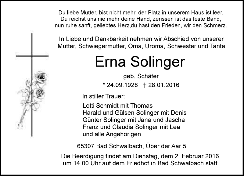 Hier finden Sie alle Traueranzeigen aus der Zeitung, die bisher für Erna Solinger erschienen sind. Weitere Traueranzeigen, die in der Zeitung erscheinen, werden hier ebenfalls aufgelistet