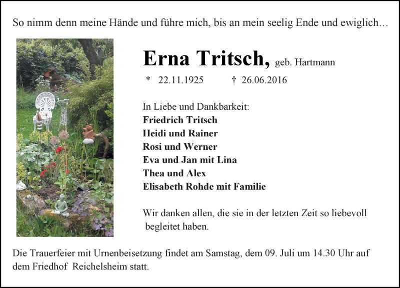 Hier finden Sie alle Traueranzeigen aus der Zeitung, die bisher für Erna Tritsch erschienen sind. Weitere Traueranzeigen, die in der Zeitung erscheinen, werden hier ebenfalls aufgelistet
