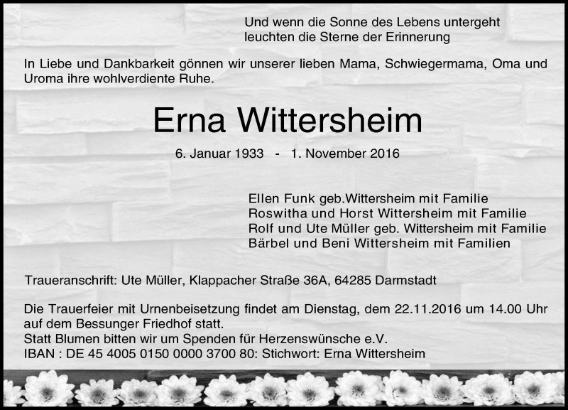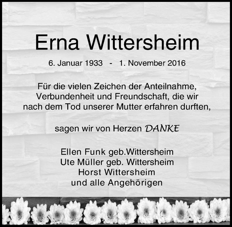 Hier finden Sie alle Traueranzeigen aus der Zeitung, die bisher für Erna Wittersheim erschienen sind. Weitere Traueranzeigen, die in der Zeitung erscheinen, werden hier ebenfalls aufgelistet