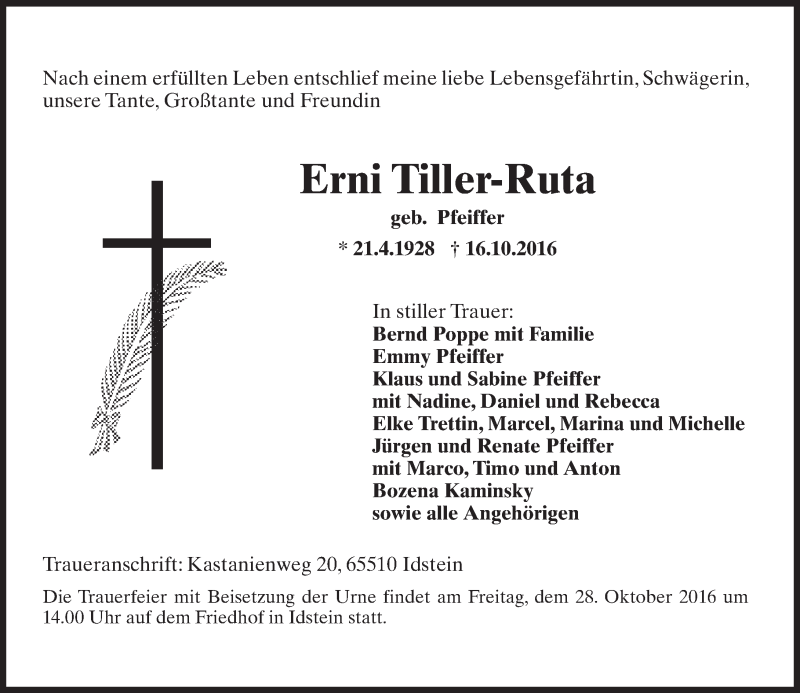 Hier finden Sie alle Traueranzeigen aus der Zeitung, die bisher für Erni Tiller-Ruta erschienen sind. Weitere Traueranzeigen, die in der Zeitung erscheinen, werden hier ebenfalls aufgelistet