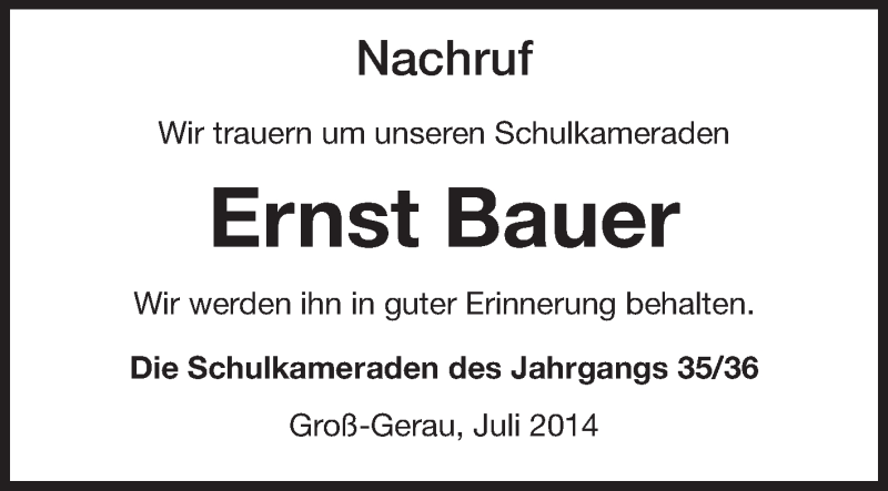 Hier finden Sie alle Traueranzeigen aus der Zeitung, die bisher für Ernst Bauer erschienen sind. Weitere Traueranzeigen, die in der Zeitung erscheinen, werden hier ebenfalls aufgelistet