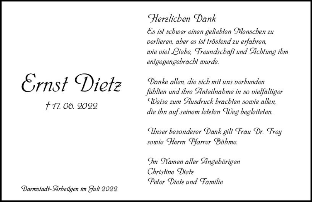 Hier finden Sie alle Traueranzeigen aus der Zeitung, die bisher für Ernst Dietz erschienen sind. Weitere Traueranzeigen, die in der Zeitung erscheinen, werden hier ebenfalls aufgelistet