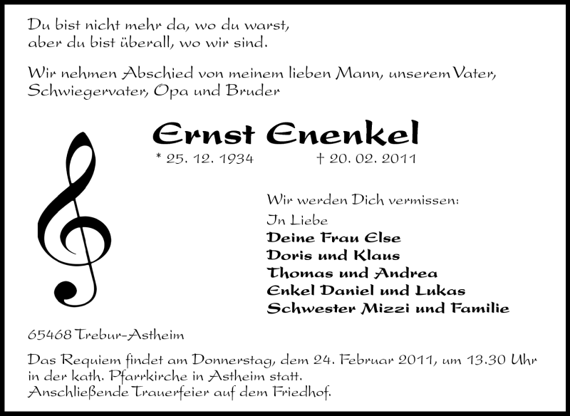 Hier finden Sie alle Traueranzeigen aus der Zeitung, die bisher für Ernst Enenkel erschienen sind. Weitere Traueranzeigen, die in der Zeitung erscheinen, werden hier ebenfalls aufgelistet
