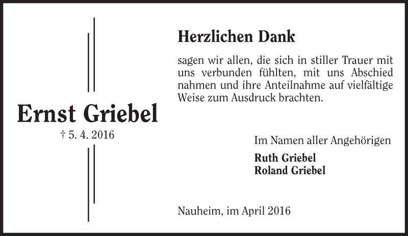 Hier finden Sie alle Traueranzeigen aus der Zeitung, die bisher für Ernst Griebel erschienen sind. Weitere Traueranzeigen, die in der Zeitung erscheinen, werden hier ebenfalls aufgelistet