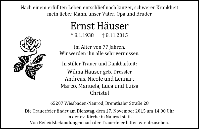 Hier finden Sie alle Traueranzeigen aus der Zeitung, die bisher für Ernst Häuser erschienen sind. Weitere Traueranzeigen, die in der Zeitung erscheinen, werden hier ebenfalls aufgelistet