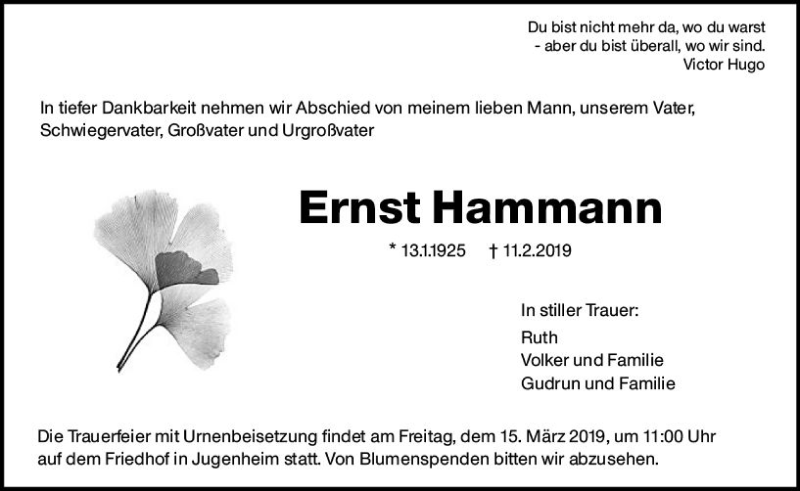 Hier finden Sie alle Traueranzeigen aus der Zeitung, die bisher für Ernst Hammann erschienen sind. Weitere Traueranzeigen, die in der Zeitung erscheinen, werden hier ebenfalls aufgelistet