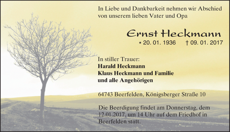 Hier finden Sie alle Traueranzeigen aus der Zeitung, die bisher für Ernst Heckmann erschienen sind. Weitere Traueranzeigen, die in der Zeitung erscheinen, werden hier ebenfalls aufgelistet