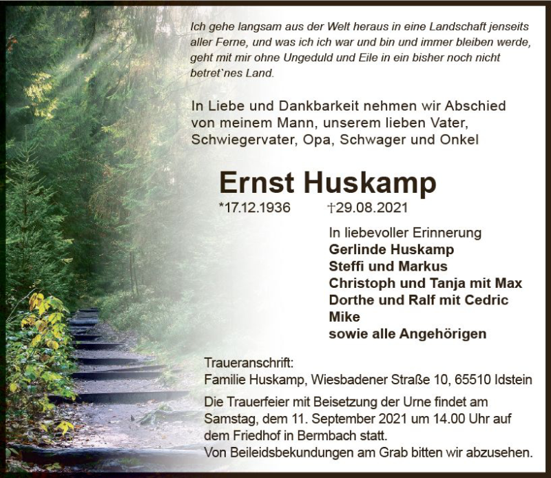 Hier finden Sie alle Traueranzeigen aus der Zeitung, die bisher für Ernst Huskamp erschienen sind. Weitere Traueranzeigen, die in der Zeitung erscheinen, werden hier ebenfalls aufgelistet