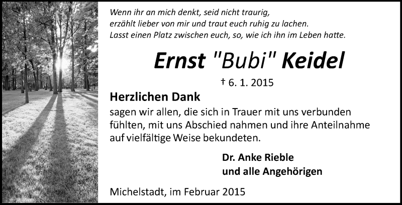 Hier finden Sie alle Traueranzeigen aus der Zeitung, die bisher für Ernst Keidel erschienen sind. Weitere Traueranzeigen, die in der Zeitung erscheinen, werden hier ebenfalls aufgelistet
