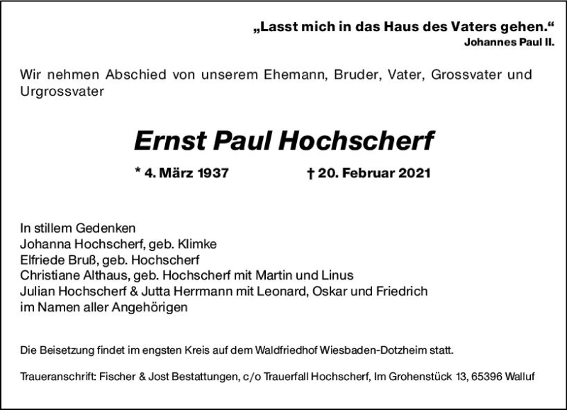 Hier finden Sie alle Traueranzeigen aus der Zeitung, die bisher für Ernst Paul Hochscherf erschienen sind. Weitere Traueranzeigen, die in der Zeitung erscheinen, werden hier ebenfalls aufgelistet