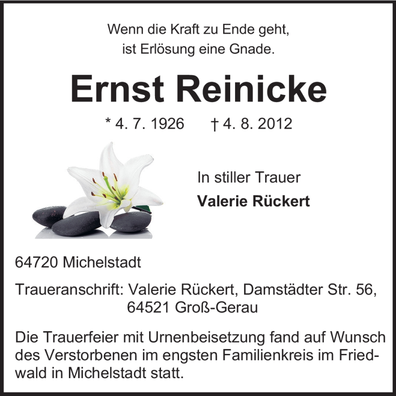 Hier finden Sie alle Traueranzeigen aus der Zeitung, die bisher für Ernst Reinicke erschienen sind. Weitere Traueranzeigen, die in der Zeitung erscheinen, werden hier ebenfalls aufgelistet