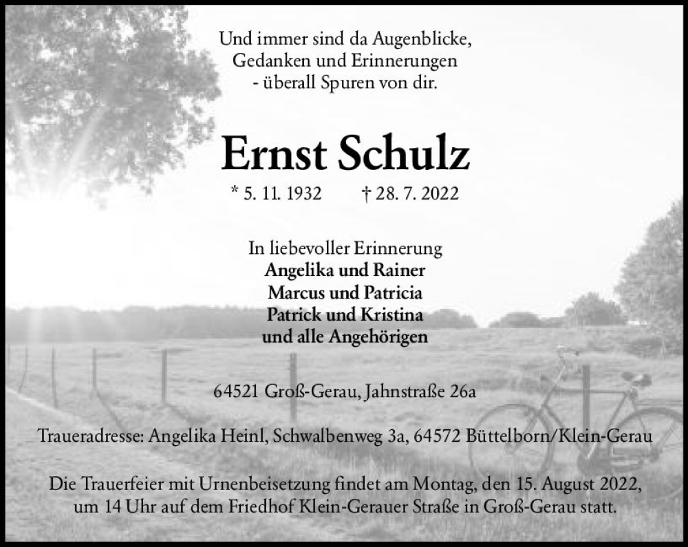 Hier finden Sie alle Traueranzeigen aus der Zeitung, die bisher für Ernst Schulz erschienen sind. Weitere Traueranzeigen, die in der Zeitung erscheinen, werden hier ebenfalls aufgelistet