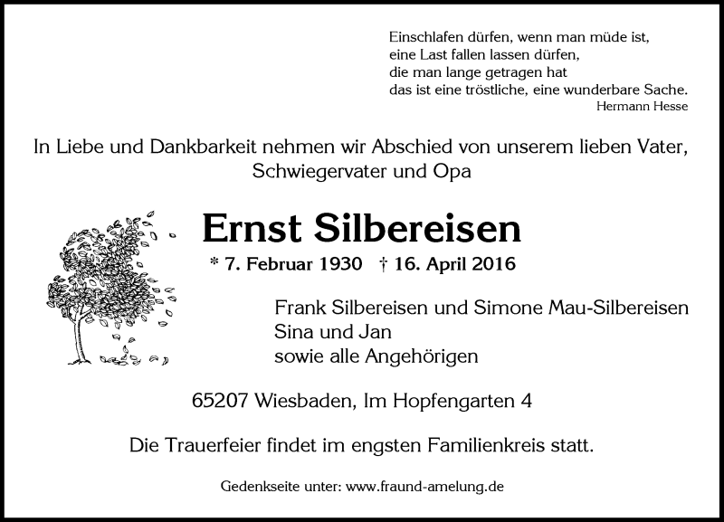 Hier finden Sie alle Traueranzeigen aus der Zeitung, die bisher für Ernst Silbereisen erschienen sind. Weitere Traueranzeigen, die in der Zeitung erscheinen, werden hier ebenfalls aufgelistet