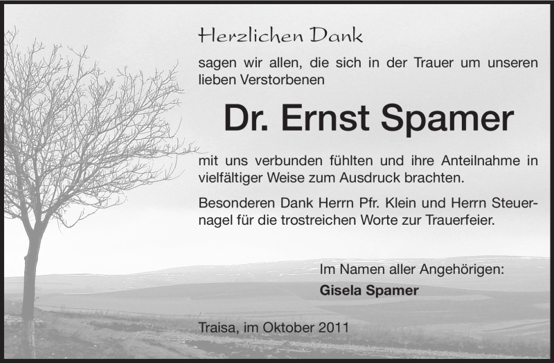 Hier finden Sie alle Traueranzeigen aus der Zeitung, die bisher für Ernst Spamer erschienen sind. Weitere Traueranzeigen, die in der Zeitung erscheinen, werden hier ebenfalls aufgelistet