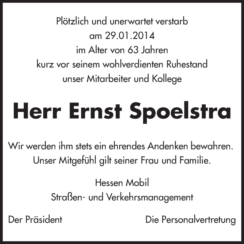 Hier finden Sie alle Traueranzeigen aus der Zeitung, die bisher für Ernst Spoelstra erschienen sind. Weitere Traueranzeigen, die in der Zeitung erscheinen, werden hier ebenfalls aufgelistet