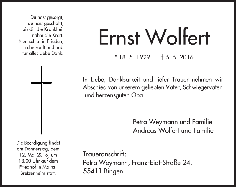 Hier finden Sie alle Traueranzeigen aus der Zeitung, die bisher für Ernst Wolfert erschienen sind. Weitere Traueranzeigen, die in der Zeitung erscheinen, werden hier ebenfalls aufgelistet