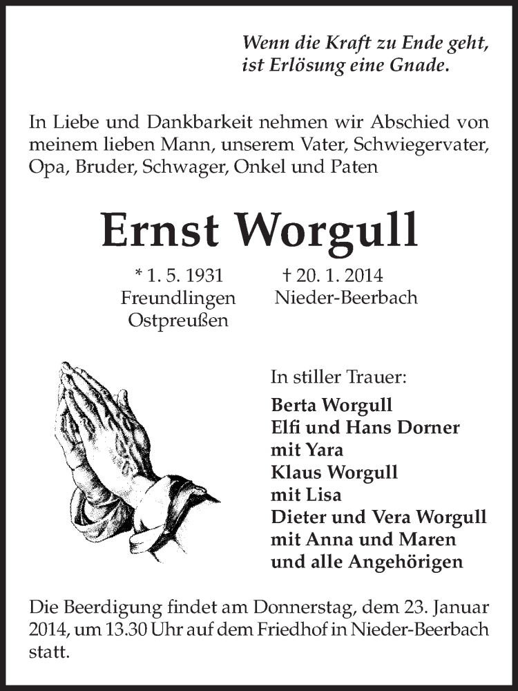 Hier finden Sie alle Traueranzeigen aus der Zeitung, die bisher für Ernst Worgull erschienen sind. Weitere Traueranzeigen, die in der Zeitung erscheinen, werden hier ebenfalls aufgelistet