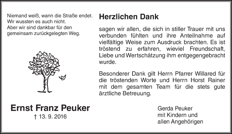Hier finden Sie alle Traueranzeigen aus der Zeitung, die bisher für Ernst Franz Peuker erschienen sind. Weitere Traueranzeigen, die in der Zeitung erscheinen, werden hier ebenfalls aufgelistet