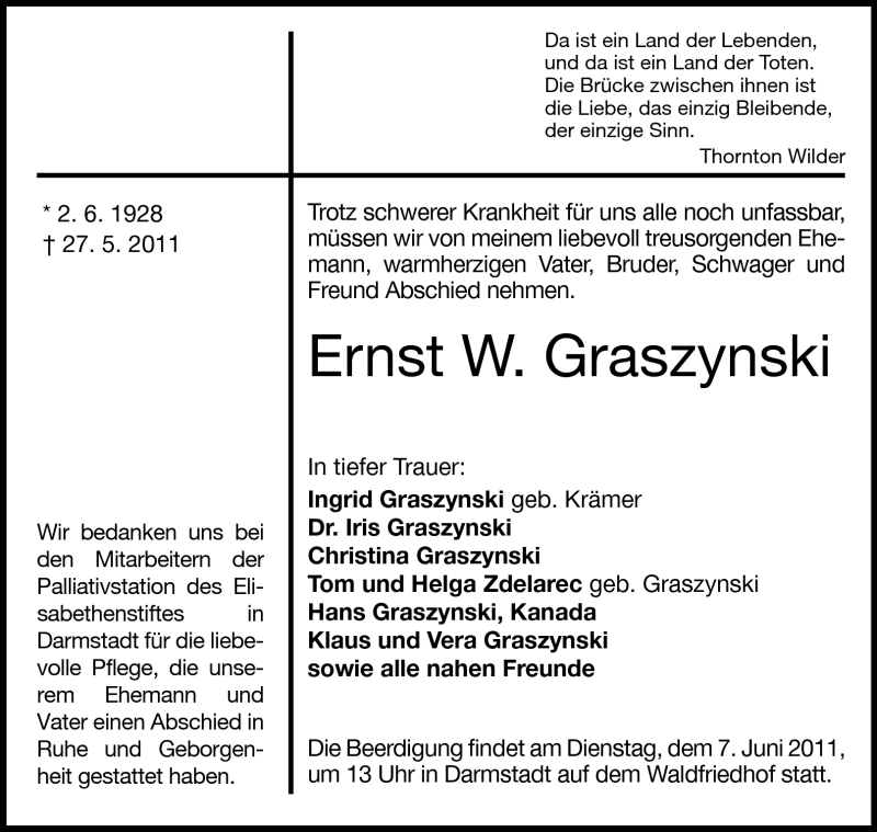 Hier finden Sie alle Traueranzeigen aus der Zeitung, die bisher für Ernst W. Graszynski erschienen sind. Weitere Traueranzeigen, die in der Zeitung erscheinen, werden hier ebenfalls aufgelistet