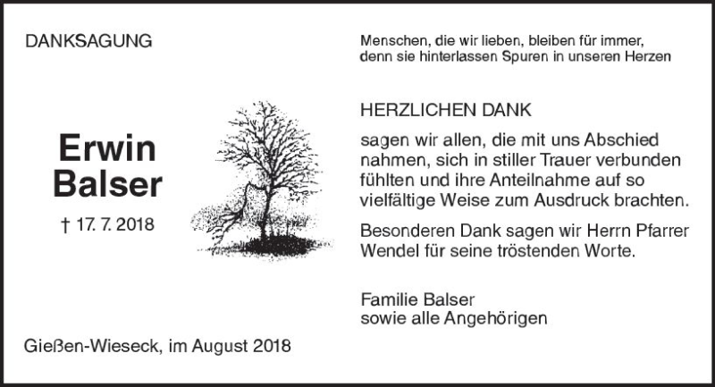Hier finden Sie alle Traueranzeigen aus der Zeitung, die bisher für Erwin Balser erschienen sind. Weitere Traueranzeigen, die in der Zeitung erscheinen, werden hier ebenfalls aufgelistet