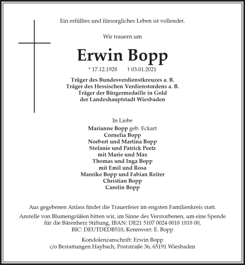 Hier finden Sie alle Traueranzeigen aus der Zeitung, die bisher für Erwin Bopp erschienen sind. Weitere Traueranzeigen, die in der Zeitung erscheinen, werden hier ebenfalls aufgelistet