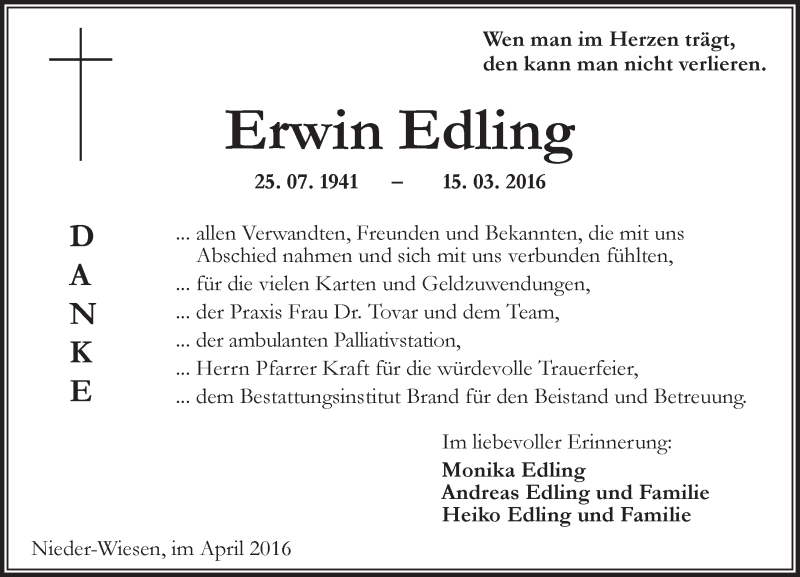 Hier finden Sie alle Traueranzeigen aus der Zeitung, die bisher für Erwin Edling erschienen sind. Weitere Traueranzeigen, die in der Zeitung erscheinen, werden hier ebenfalls aufgelistet