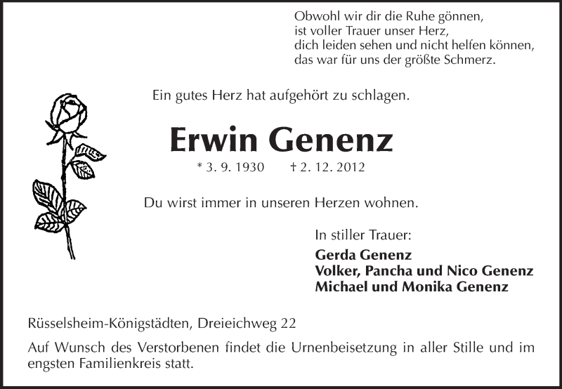 Hier finden Sie alle Traueranzeigen aus der Zeitung, die bisher für Erwin Genenz erschienen sind. Weitere Traueranzeigen, die in der Zeitung erscheinen, werden hier ebenfalls aufgelistet