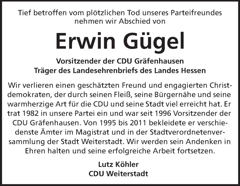 Hier finden Sie alle Traueranzeigen aus der Zeitung, die bisher für Erwin Gügel erschienen sind. Weitere Traueranzeigen, die in der Zeitung erscheinen, werden hier ebenfalls aufgelistet