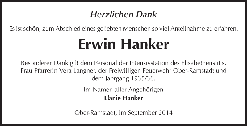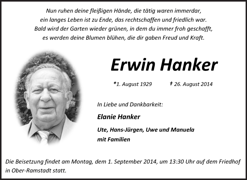 Hier finden Sie alle Traueranzeigen aus der Zeitung, die bisher für Erwin Hanker erschienen sind. Weitere Traueranzeigen, die in der Zeitung erscheinen, werden hier ebenfalls aufgelistet