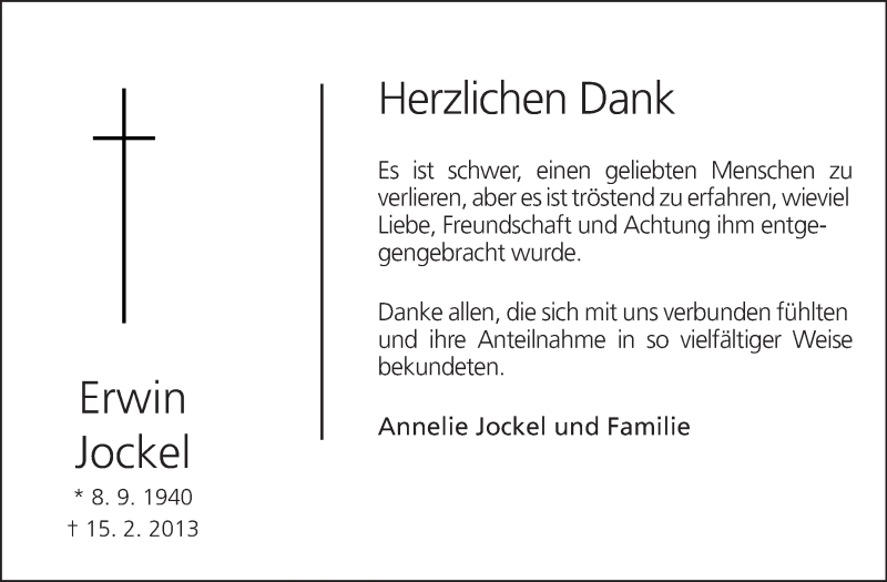 Hier finden Sie alle Traueranzeigen aus der Zeitung, die bisher für Erwin Jockel erschienen sind. Weitere Traueranzeigen, die in der Zeitung erscheinen, werden hier ebenfalls aufgelistet