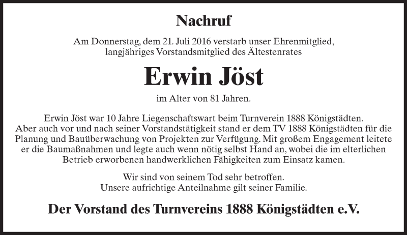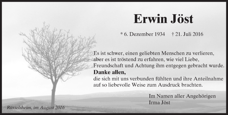 Hier finden Sie alle Traueranzeigen aus der Zeitung, die bisher für Erwin Jöst erschienen sind. Weitere Traueranzeigen, die in der Zeitung erscheinen, werden hier ebenfalls aufgelistet