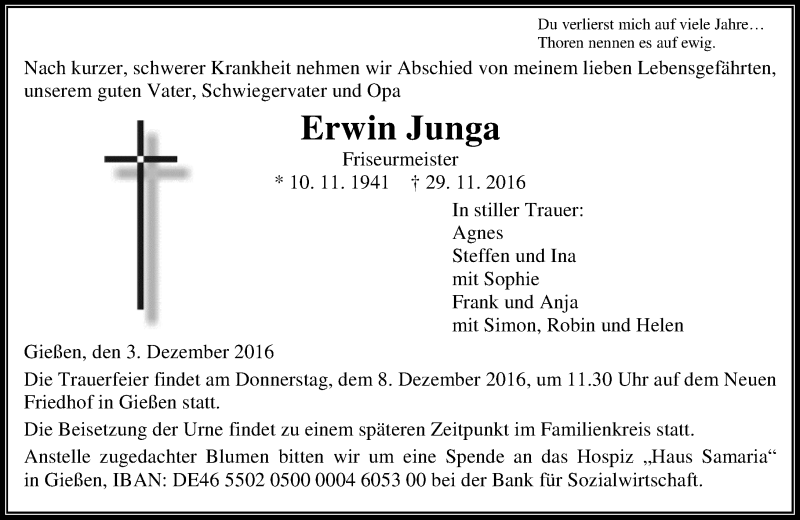 Hier finden Sie alle Traueranzeigen aus der Zeitung, die bisher für Erwin Junga erschienen sind. Weitere Traueranzeigen, die in der Zeitung erscheinen, werden hier ebenfalls aufgelistet