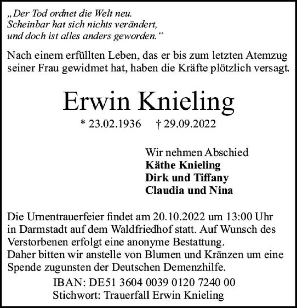 Hier finden Sie alle Traueranzeigen aus der Zeitung, die bisher für Erwin Knieling erschienen sind. Weitere Traueranzeigen, die in der Zeitung erscheinen, werden hier ebenfalls aufgelistet