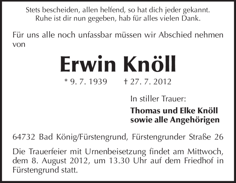 Hier finden Sie alle Traueranzeigen aus der Zeitung, die bisher für Erwin Knöll erschienen sind. Weitere Traueranzeigen, die in der Zeitung erscheinen, werden hier ebenfalls aufgelistet