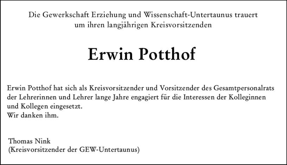 Hier finden Sie alle Traueranzeigen aus der Zeitung, die bisher für Erwin Potthof erschienen sind. Weitere Traueranzeigen, die in der Zeitung erscheinen, werden hier ebenfalls aufgelistet