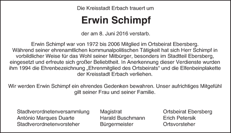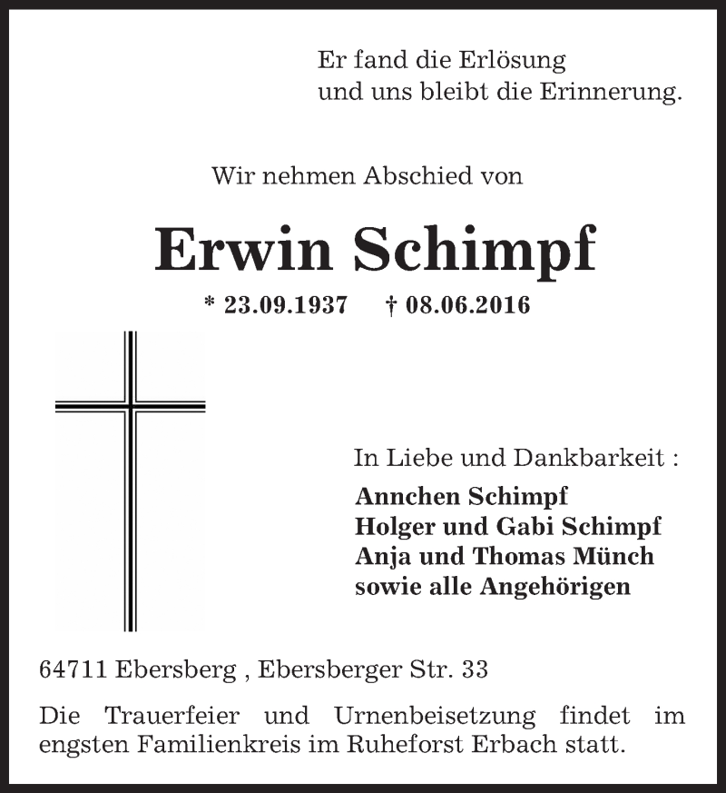 Hier finden Sie alle Traueranzeigen aus der Zeitung, die bisher für Erwin Schimpf erschienen sind. Weitere Traueranzeigen, die in der Zeitung erscheinen, werden hier ebenfalls aufgelistet