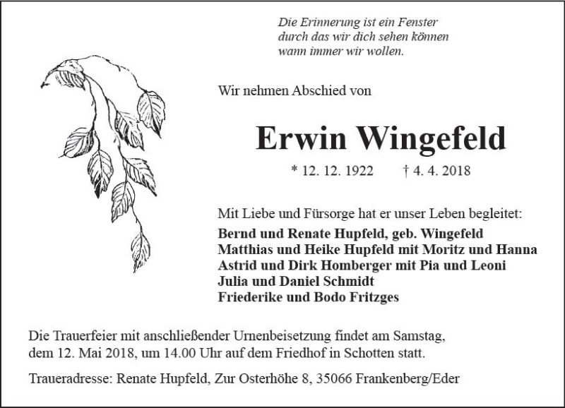 Hier finden Sie alle Traueranzeigen aus der Zeitung, die bisher für Erwin Wingefeld erschienen sind. Weitere Traueranzeigen, die in der Zeitung erscheinen, werden hier ebenfalls aufgelistet