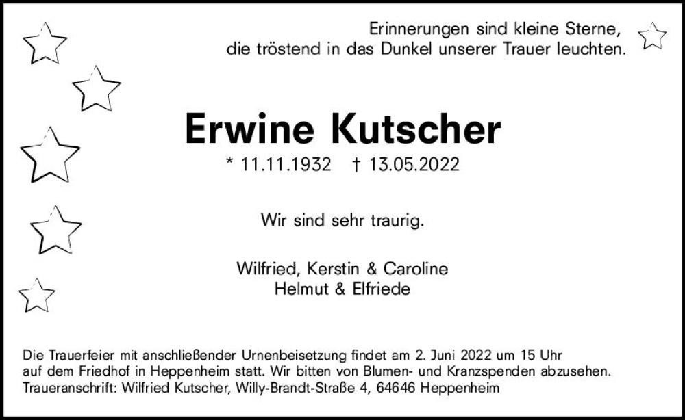 Hier finden Sie alle Traueranzeigen aus der Zeitung, die bisher für Erwine Kutscher erschienen sind. Weitere Traueranzeigen, die in der Zeitung erscheinen, werden hier ebenfalls aufgelistet