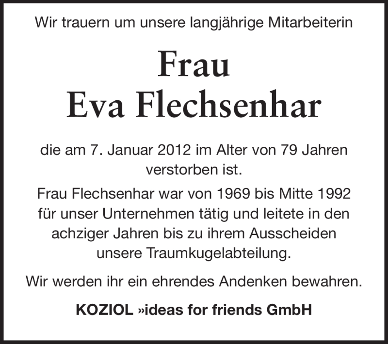 Hier finden Sie alle Traueranzeigen aus der Zeitung, die bisher für Eva Flechsenhar erschienen sind. Weitere Traueranzeigen, die in der Zeitung erscheinen, werden hier ebenfalls aufgelistet