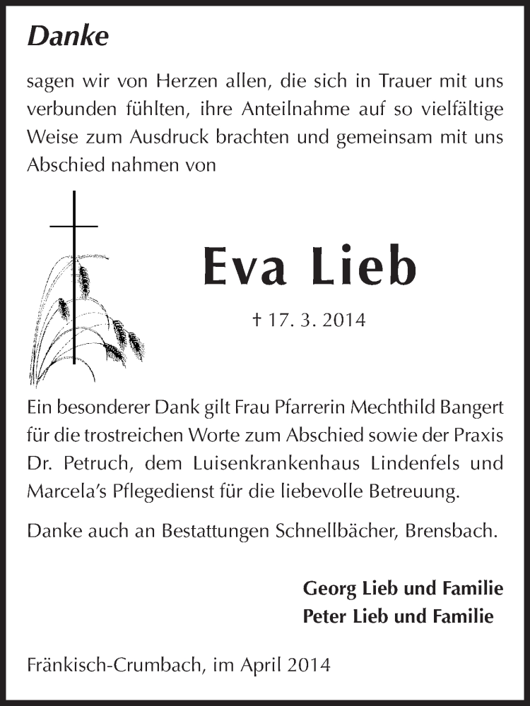 Hier finden Sie alle Traueranzeigen aus der Zeitung, die bisher für Eva Lieb erschienen sind. Weitere Traueranzeigen, die in der Zeitung erscheinen, werden hier ebenfalls aufgelistet
