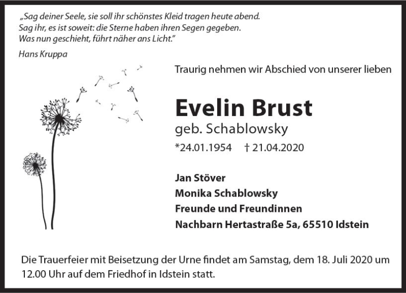 Hier finden Sie alle Traueranzeigen aus der Zeitung, die bisher für Evelin Brust erschienen sind. Weitere Traueranzeigen, die in der Zeitung erscheinen, werden hier ebenfalls aufgelistet