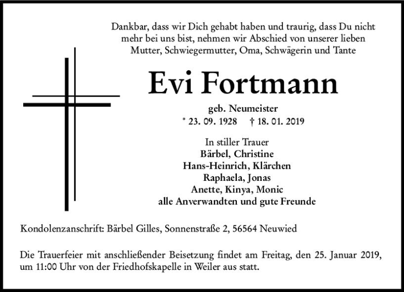 Hier finden Sie alle Traueranzeigen aus der Zeitung, die bisher für Evi Fortmann erschienen sind. Weitere Traueranzeigen, die in der Zeitung erscheinen, werden hier ebenfalls aufgelistet