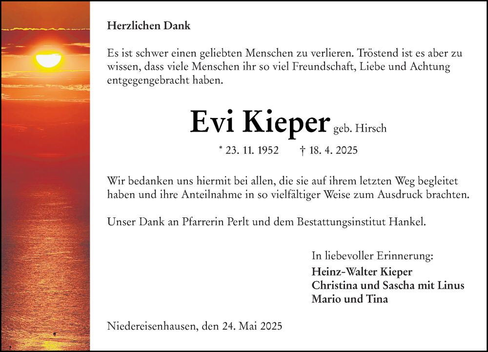 Hier finden Sie alle Traueranzeigen aus der Zeitung, die bisher für Evi Kieper erschienen sind. Weitere Traueranzeigen, die in der Zeitung erscheinen, werden hier ebenfalls aufgelistet