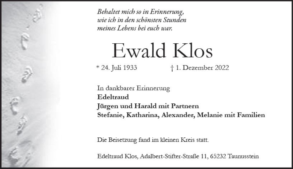 Hier finden Sie alle Traueranzeigen aus der Zeitung, die bisher für Ewald Klos erschienen sind. Weitere Traueranzeigen, die in der Zeitung erscheinen, werden hier ebenfalls aufgelistet