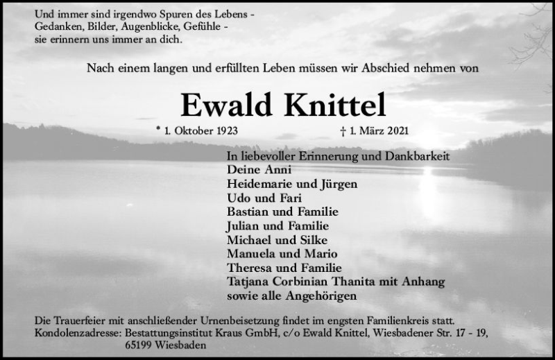Hier finden Sie alle Traueranzeigen aus der Zeitung, die bisher für Ewald Knittel erschienen sind. Weitere Traueranzeigen, die in der Zeitung erscheinen, werden hier ebenfalls aufgelistet