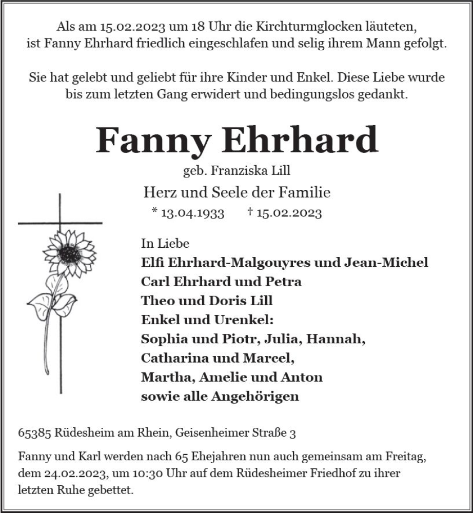 Hier finden Sie alle Traueranzeigen aus der Zeitung, die bisher für Fanny Ehrhard erschienen sind. Weitere Traueranzeigen, die in der Zeitung erscheinen, werden hier ebenfalls aufgelistet