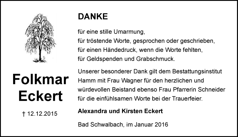 Hier finden Sie alle Traueranzeigen aus der Zeitung, die bisher für Folkmar Eckert erschienen sind. Weitere Traueranzeigen, die in der Zeitung erscheinen, werden hier ebenfalls aufgelistet