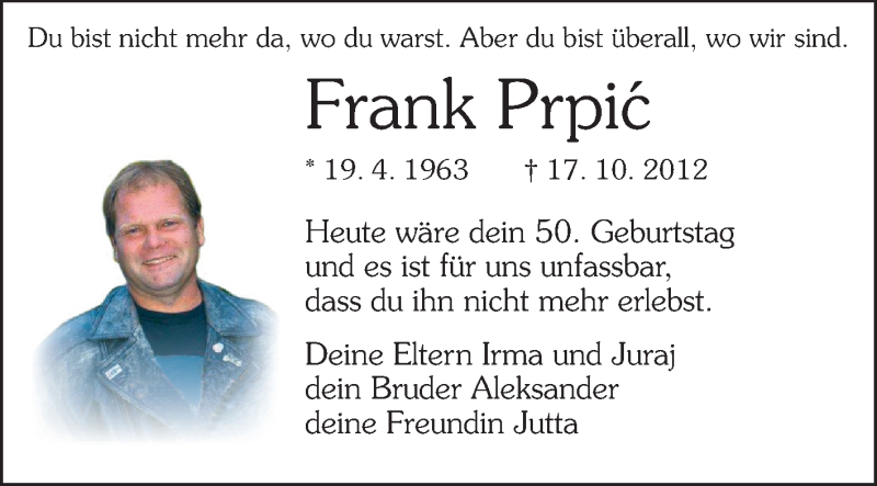 Hier finden Sie alle Traueranzeigen aus der Zeitung, die bisher für Frank Prpic erschienen sind. Weitere Traueranzeigen, die in der Zeitung erscheinen, werden hier ebenfalls aufgelistet