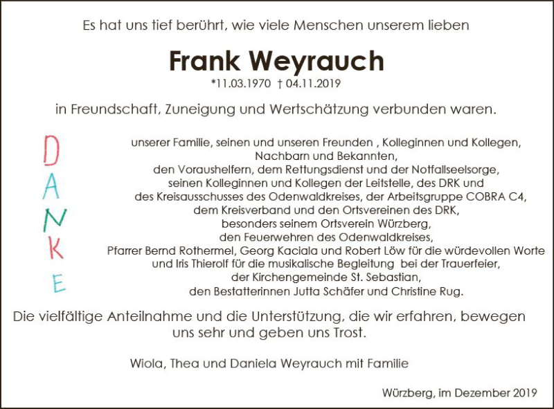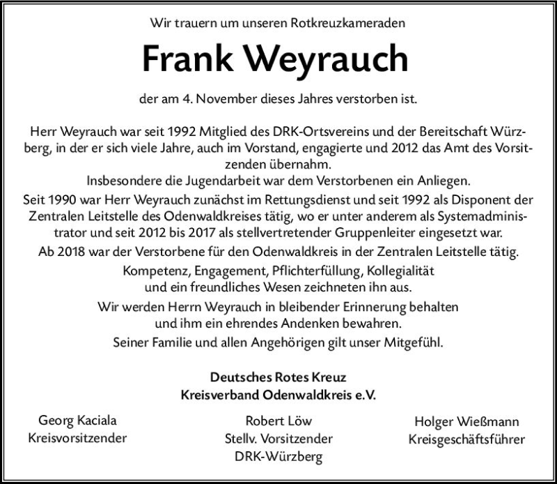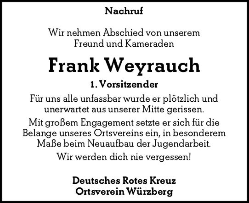 Hier finden Sie alle Traueranzeigen aus der Zeitung, die bisher für Frank Weyrauch erschienen sind. Weitere Traueranzeigen, die in der Zeitung erscheinen, werden hier ebenfalls aufgelistet